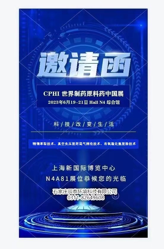 CPHI世界制药原料药中国展,2023年6约19日-21日在上海新国际博览中心举办,石家庄辰泰环境科技有限公司展位 N4A81,恭候您的光临。